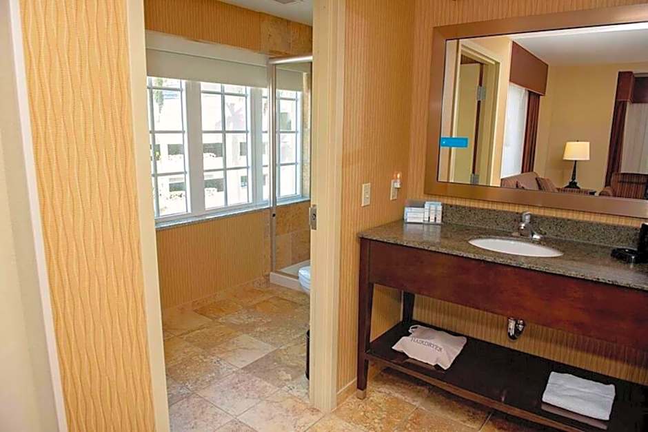 This studio has a seating area, small refrigerator, coffee machine, and microwave. The accessible bathroom has a roll-in shower, hairdryer, and free toiletries.